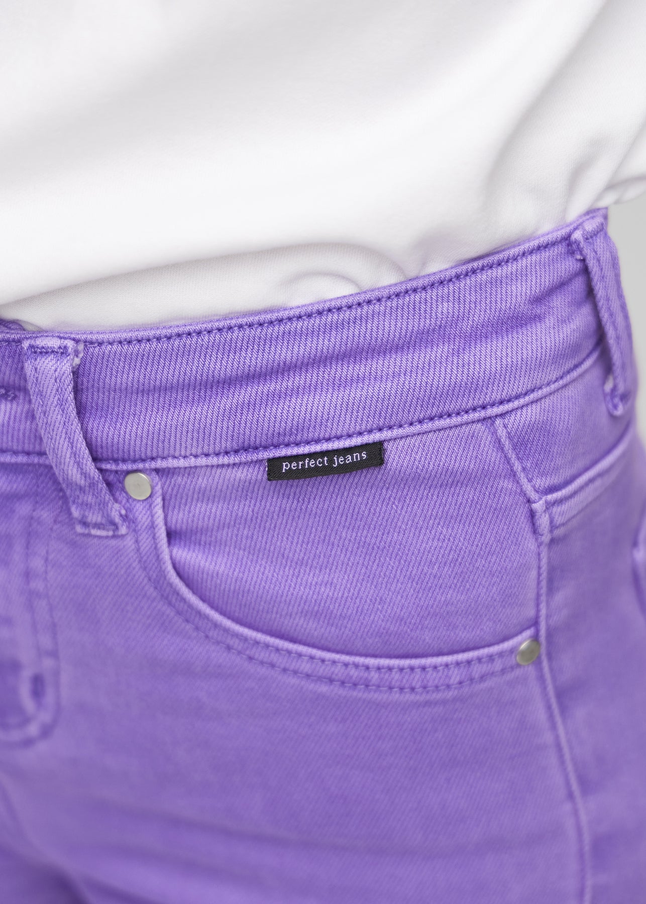 Nærbillede af lilla jeansmateriale med Perfect Jeans logoetiket ved forlommekanten.