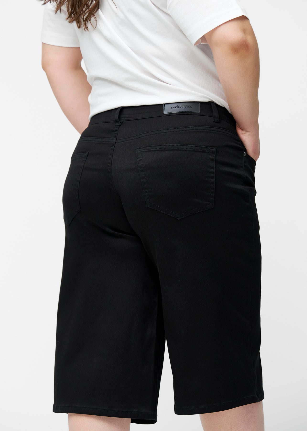 Nahaufnahme von schwarzem Jeansmaterial mit Perfect Jeans Logoetikett an der Vorderkante der Tasche auf einem Plus-Size-Modell.