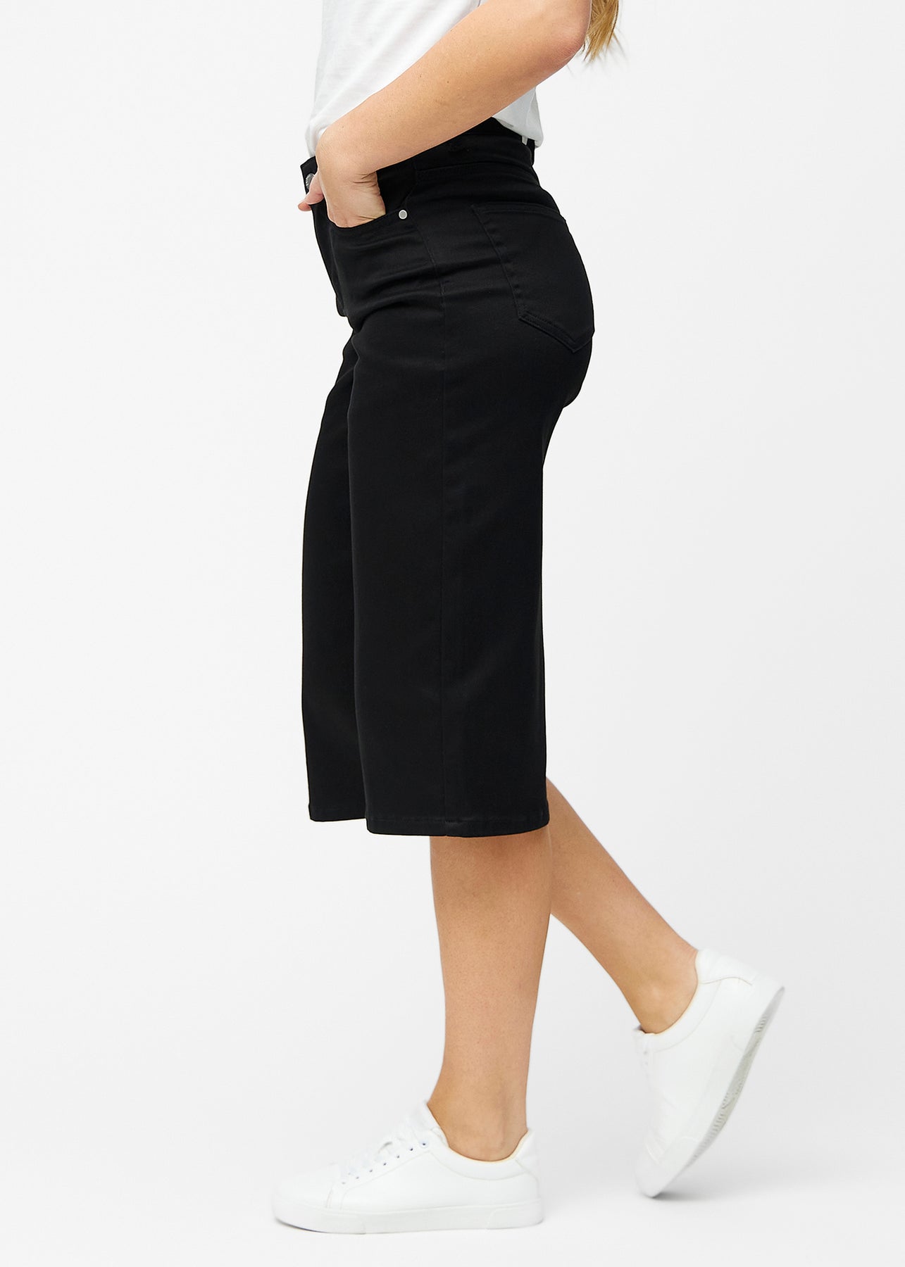 Løse, sorte capris i farven Ravens set fra siden på plus-size model, hvor den brede pasform og længden til lige under knæet er synlig.