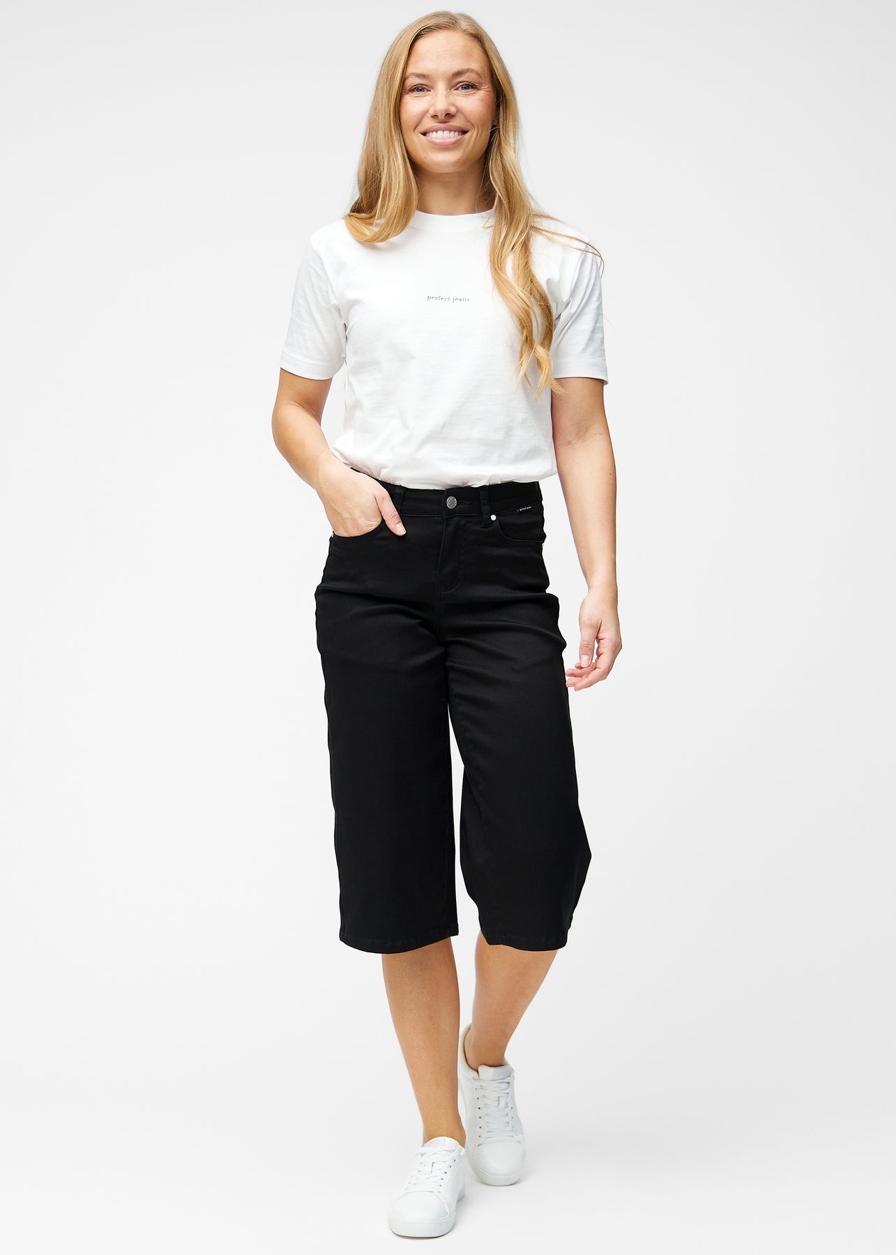 Fuldt billede af model i løse, sorte capris i farven Ravens, der går til lige under knæet.