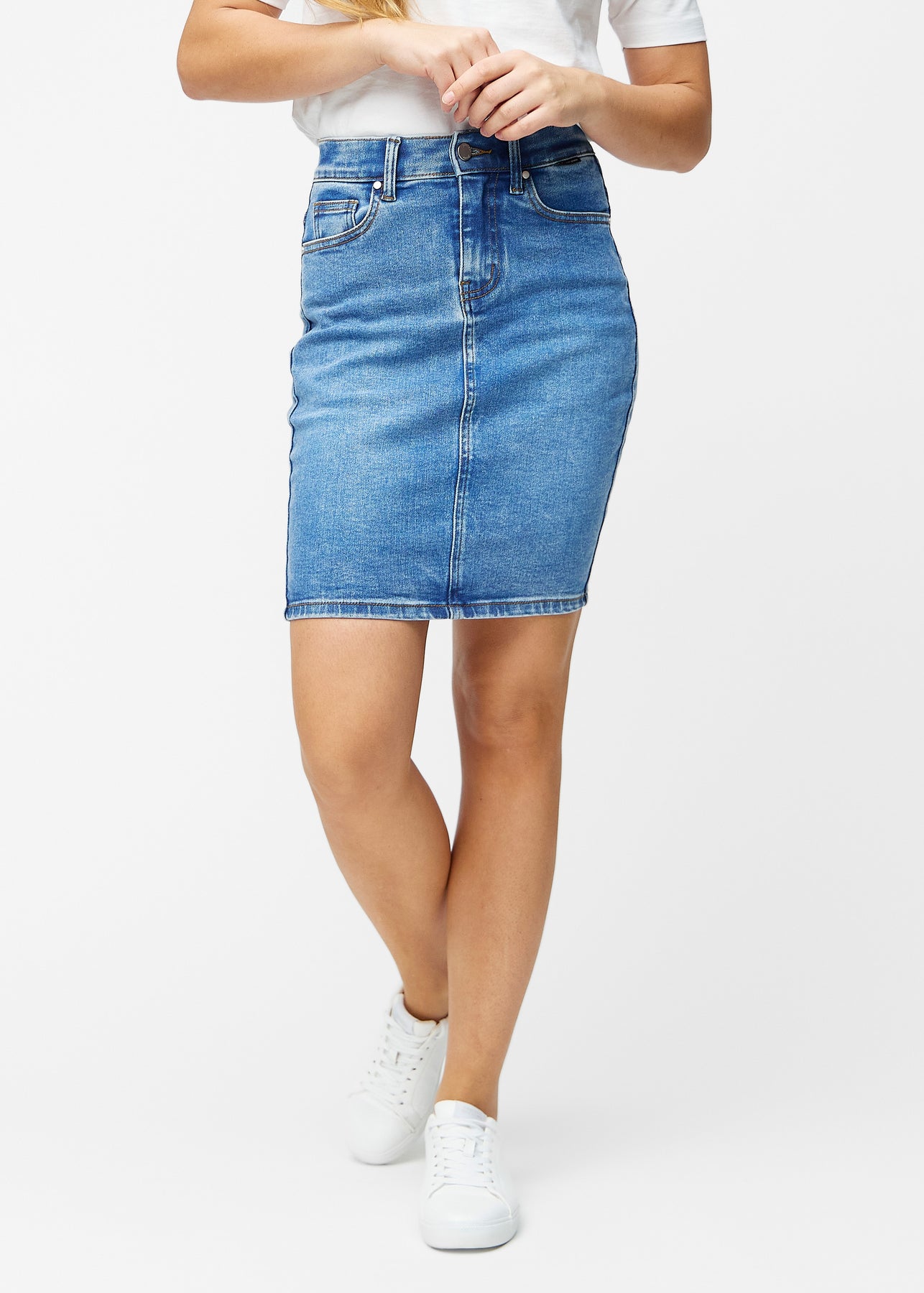 Klassisk blå, tætsiddende og knælang denimnederdel i farven Rivers set forfra.